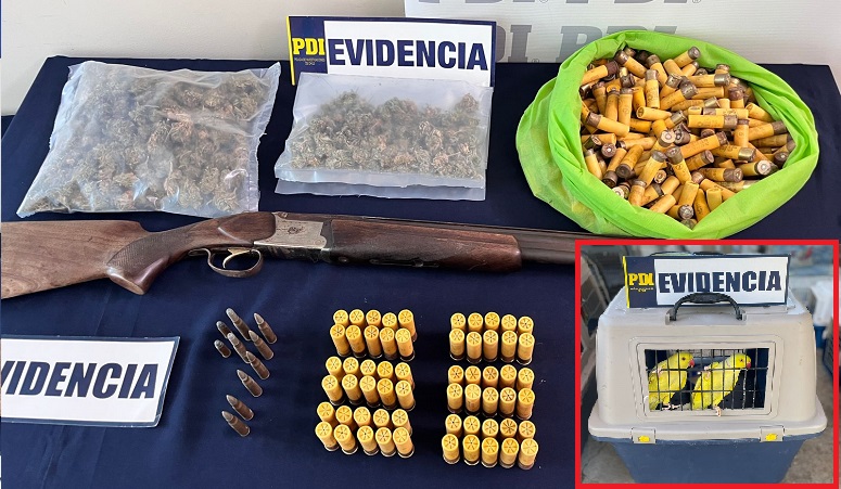 “Detectives de esta unidad territorial desarrollaron el procedimiento en un domicilio de la localidad de Tambillos, donde su residente mantenía, en forma ilegal, 106 ejemplares de aves exóticas en cautiverio. Con la orden judicial para la entrada y registro del inmueble, incautamos un arma de fuego y municiones de diverso calibre, incluso de guerra junto con droga procesada, a granel, del género cannabis”, informó el subprefecto José Luis Ortega, jefe de la Brigada de Investigación Criminal Coquimbo.