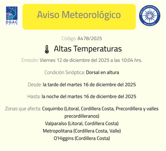 La Dirección Meteorológica de Chile (DMC), a través del Aviso Meteorológico A478/2025 de Altas Temperaturas, difundido este viernes 12 de diciembre 2025, a las 10:04 hrs., informa alerta por altas temperaturas por Condición Sinóptica Dorsal en altura.